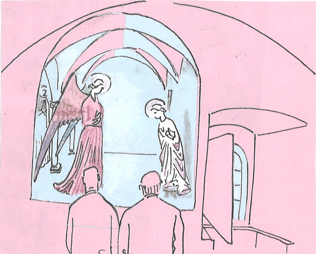 Don Hugo: El fresco es contemplación, es la idea pura plasmada en una sola jornada, que no admite arrepentimientos ni añadidos, so pena de picar toda la pared y volver a empezar. Es la pureza del agua que se evapora, el polvo mineral que se fija y la cal virginal… El fresco es claro, limpio, liso, mate, simple, inmaterial… ¡una aparición a través de la pared!… ¡No se compran frescos en el mercado!