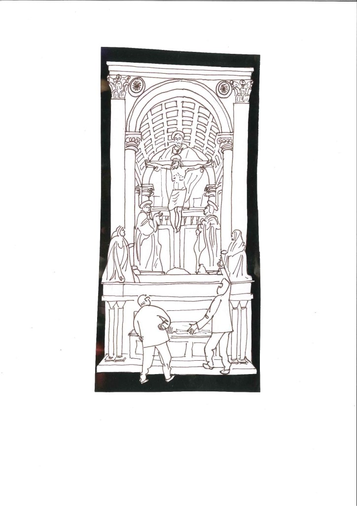 Don Hugo: Las Tres Personas aparecen representadas frontalmente, ¡vamos como los bizantinos!, sin tener en cuenta la posición inferior del espectador, en contraste con el resto de la obra.